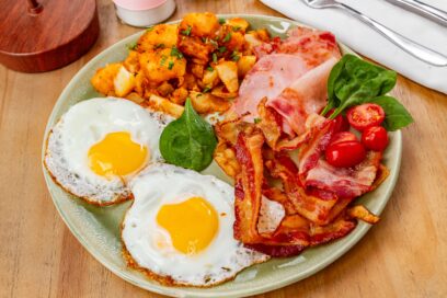 Two farm eggs any style, home fries, choose 2 meats from ham, bacon or sausage -